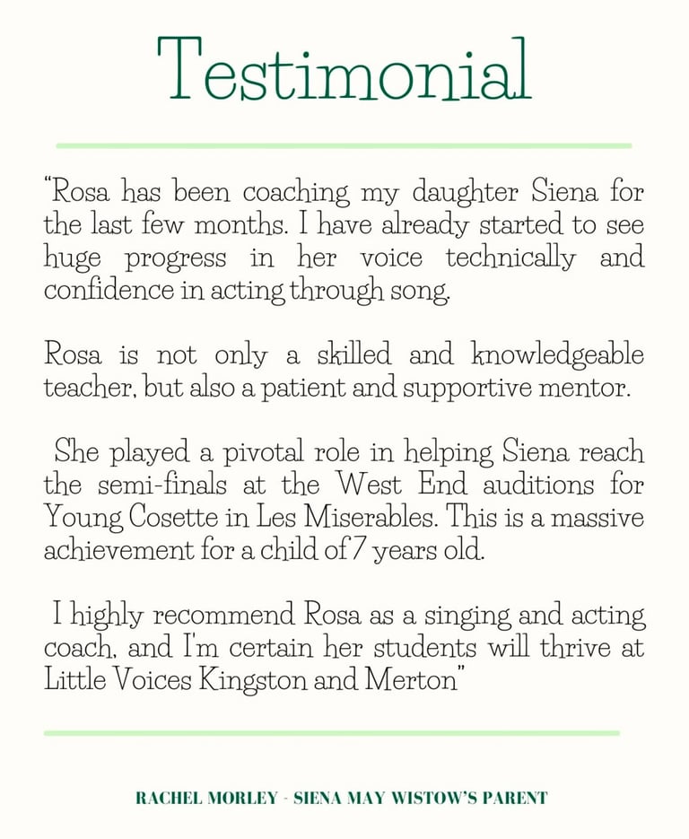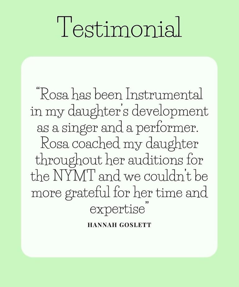 Rosa can help with building confidence, musicality, rep, performance, industry insight and working towards auditions as well as focusing on vocal health.